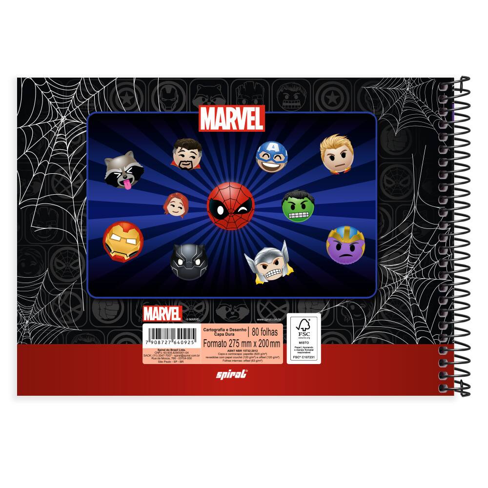 Caderno de cartografia e desenho, Capa dura, 80 folhas, Marvel Emoji, 2640925, Spiral Mve - PT 1 UN