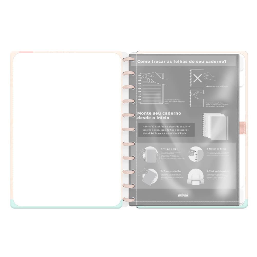 A parte interna do caderno conta com 80 folhas que proporcionam uma escrita suave e confortável. As folhas são adequadas para qualquer tipo de caneta ou lápis, permitindo que você expresse sua criatividade sem preocupações. Além disso, o sistema de disco espiral permite que você adicione ou remova folhas facilmente, personalizando seu caderno da maneira que preferir!