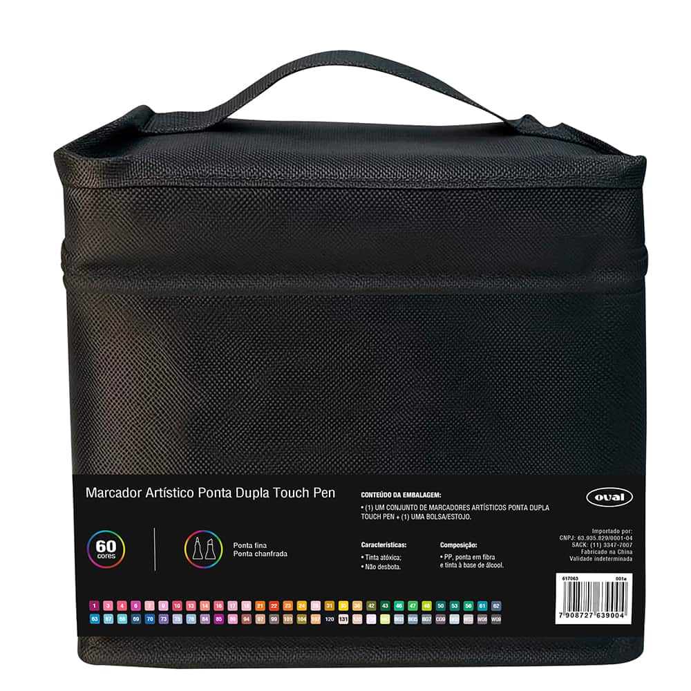 Caneta Marcadora Artística Touch Pen 60 Cores Ponta Dupla (Chanfrada e Fina) com Estojo com Zíper, Oval - BT 60 UN