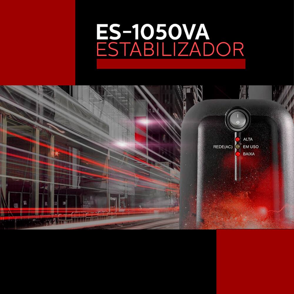 A segurança dos seus equipamentos é nossa prioridade. O estabilizador conta com proteção contra surtos de tensão e curto-circuito, proporcionando uma camada extra de segurança que você pode confiar. Invista na proteção e eficiência dos seus dispositivos. O Estabilizador ES-1050VA é a escolha perfeita para quem busca praticidade e confiança em um só produto.