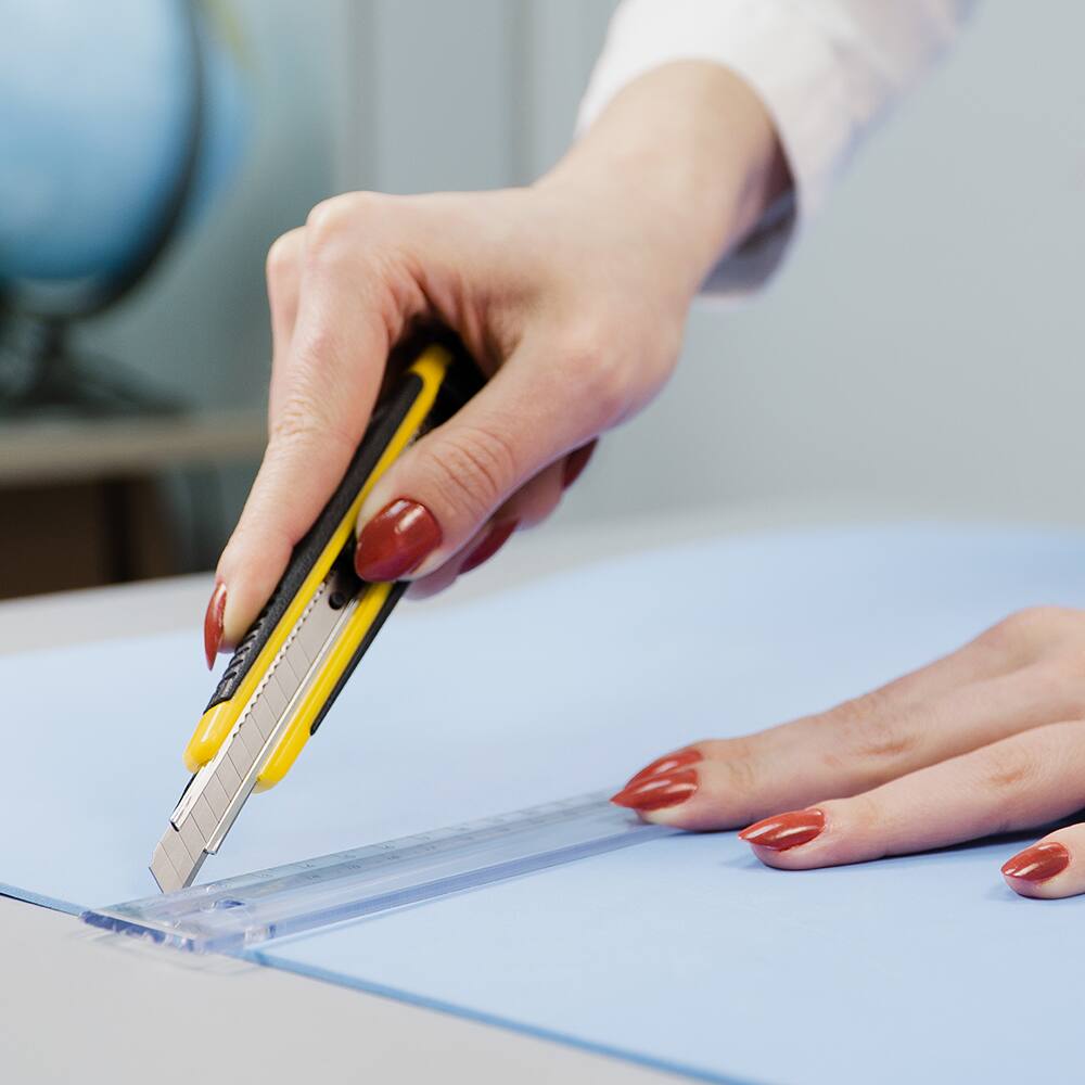 O estilete conta com um sistema retrátil que ajuda no uso e na troca de lâmina.