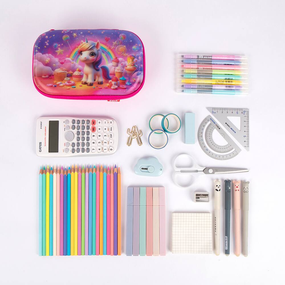 Estojo Escolar Unicorn Pink Cloud, em formato " Box" com detalhes holográficos, tampa com efeitos holográficos composto por material EVA, leve e inquebrável resistente e durável e com revestimento externo protetor.