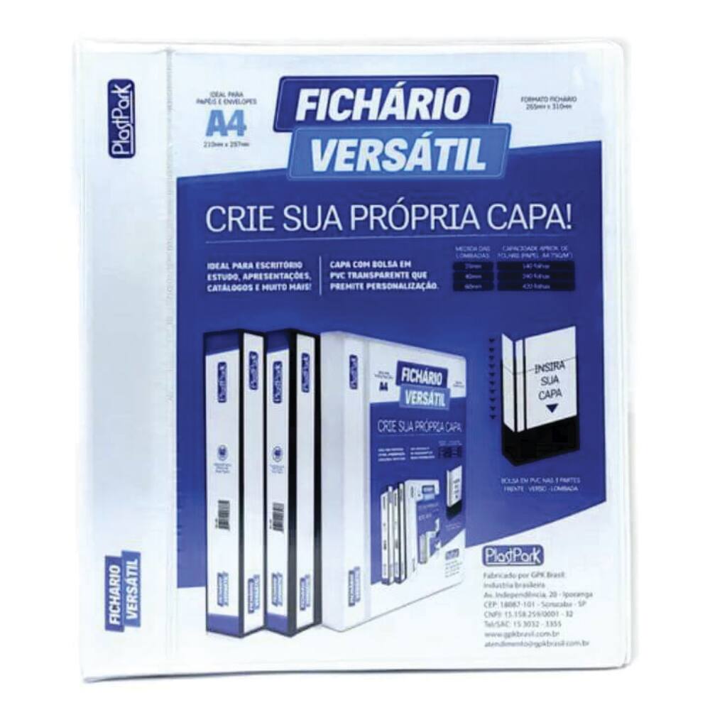 EspecificaçõesFichário A4 versátil branco, 4cm, 4 argolas. Capa com bolsa em pvc transparente que permite personalização. Avaliação do produto
