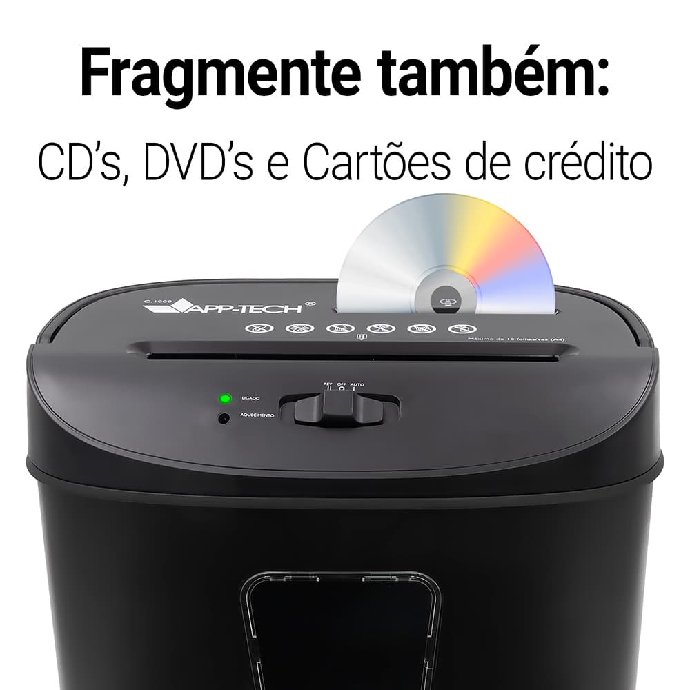 A fragmentadora C.1000 da APP-TECH, robusta e rápida, fragmenta simultaneamente até 10 folhas em particulas Também fragmenta CD/DVD cartões de crédito e cartões de visita; Acionamento e desligamento automático; Proteção Automática contra sobrecarga e aquecimento excessivo do motor.O que fragmentar: