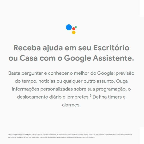Alto-falantes: Google Assistente integrado; Som em 360° com driver de 40 mm