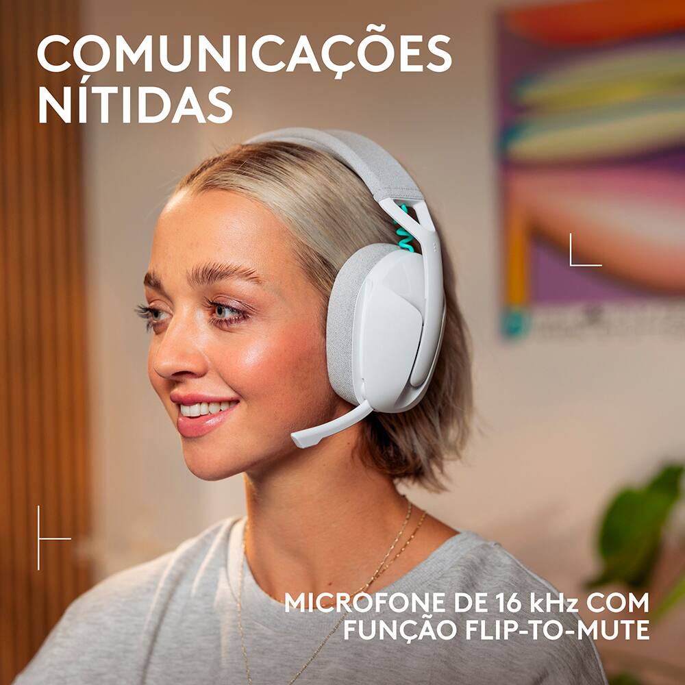 O microfone de 16 kHz com haste flip-to-mute permite comunicação clara e prática, facilitando o controle de áudio com um simples movimento.