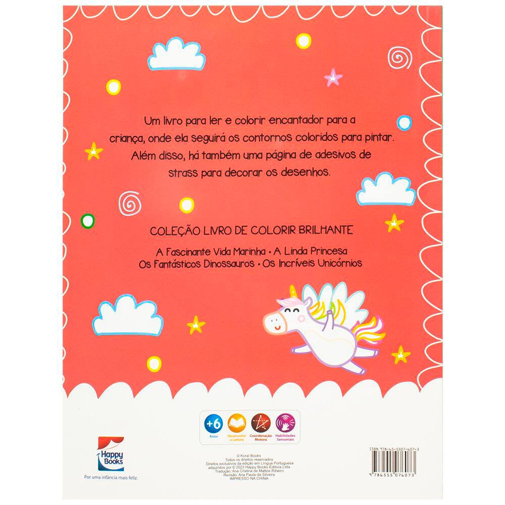 Livro para colorir infantil com 1000 adesivos de strass, Os Incríveis Unicórnios, Happy Books - PT 1 UN