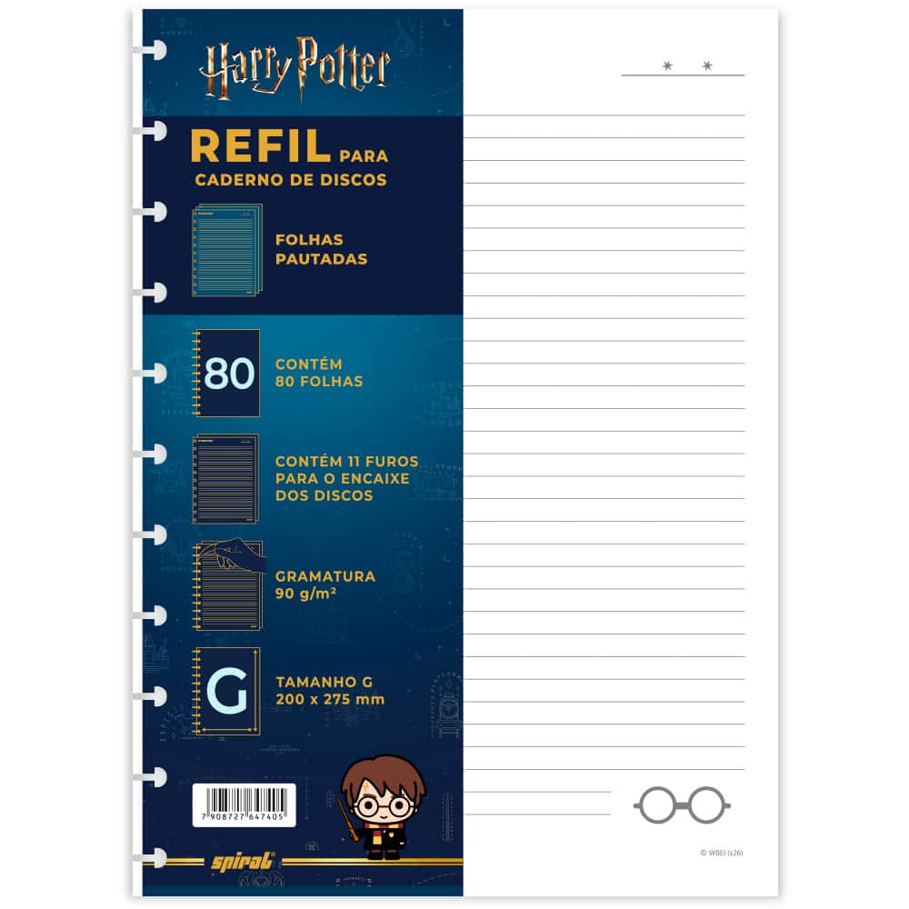 Entre no mundo mágico de Harry Potter com o Refil para Caderno de Discos Tamanho G da Spiral! Projetado especialmente para os verdadeiros fãs da saga, este refil encanta não apenas pela sua estética, mas também pela sua funcionalidade. Com 80 folhas pautadas, ele é perfeito para anotações durante as aulas.