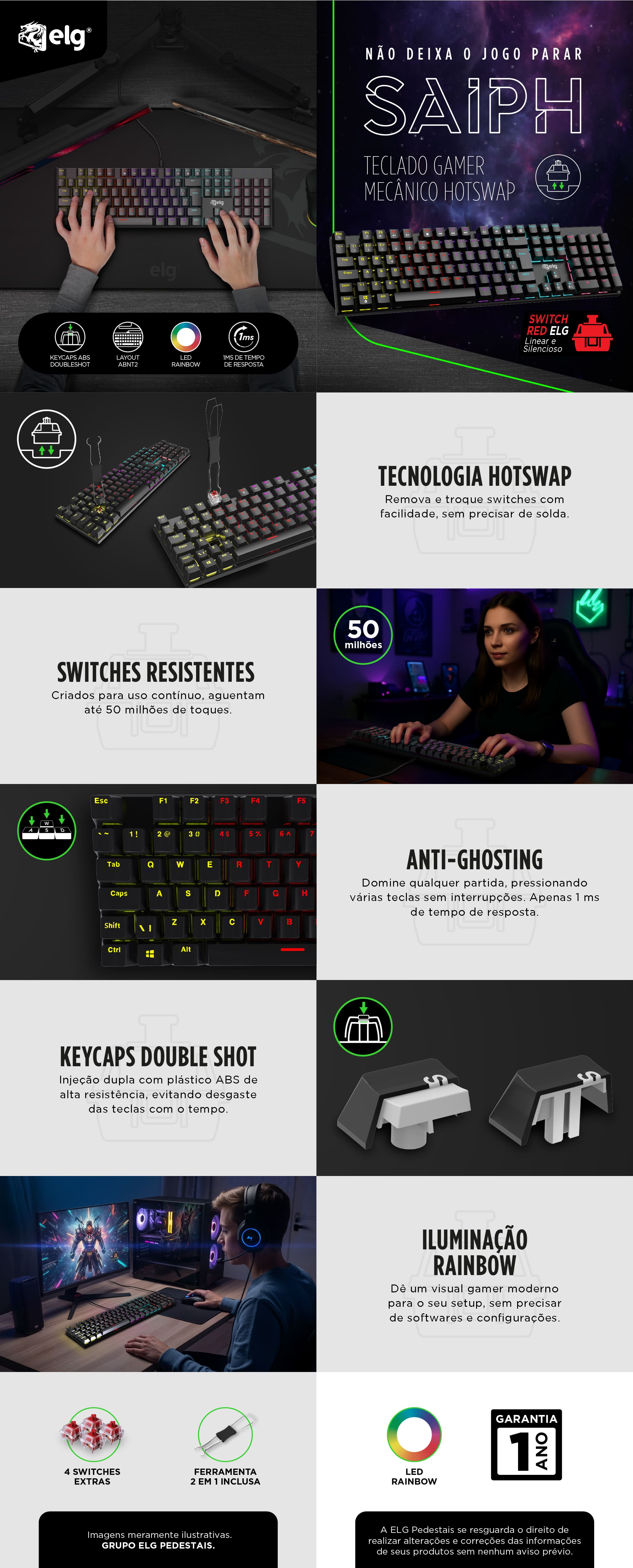 O ELG Saiph é a escolha ideal para gamers que buscam precisão, durabilidade e personalização. Equipado com tecnologia hotswap, permite a troca rápida e fácil dos switches removíveis, sem necessidade de solda, adaptando-se ao seu estilo de jogo.