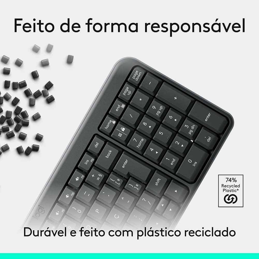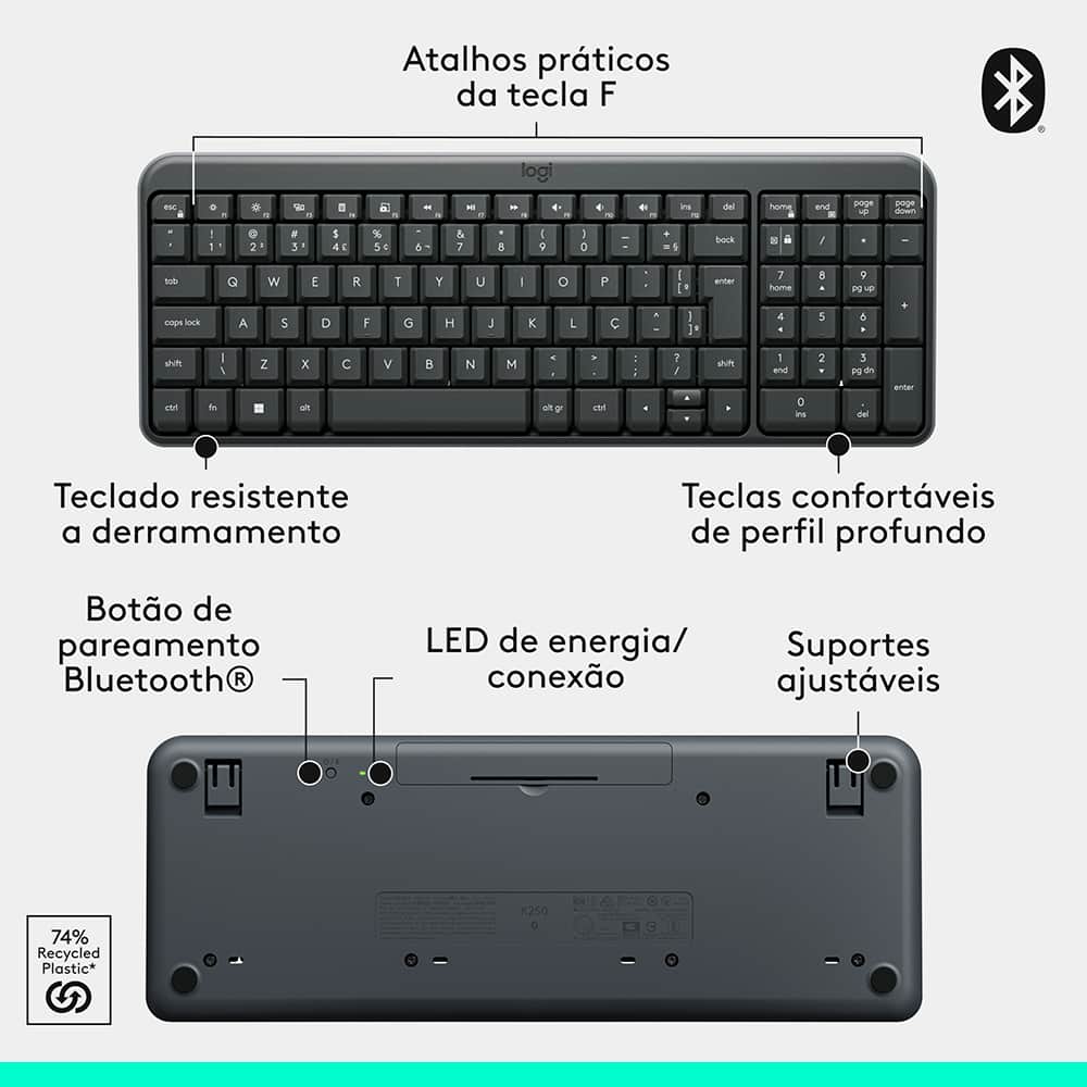 Teclado Sem Fio Logitech K250 Bluetooth com Conectividade Rápida e Fácil, Design Compacto, Teclado Numérico, Layout ABNT2, Teclas Resistentes a Derramamentos, Compatível com PC e Mac - Grafite CX 1 UN